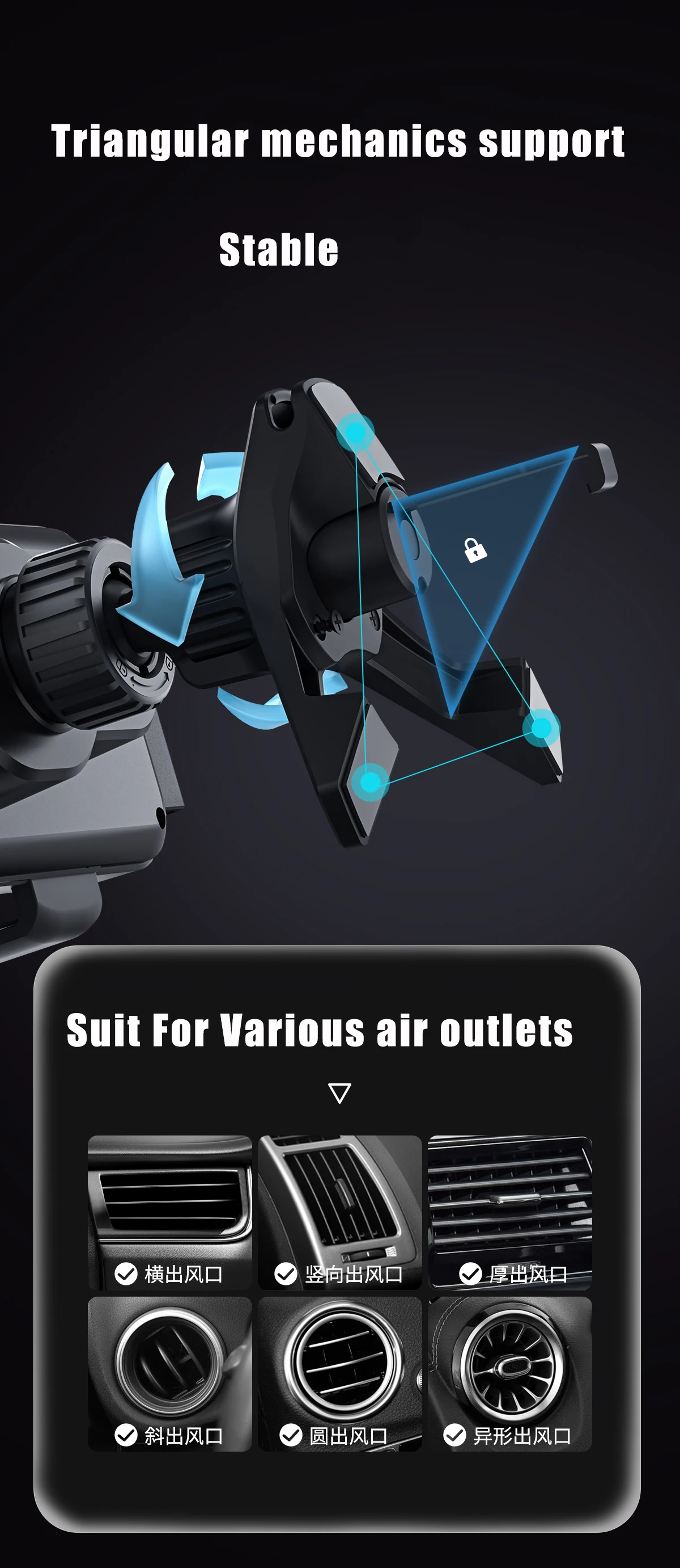 6. Stabilitate și siguranță: Căptușit cu silicon moale antiderapant și absorbant de șocuri, clemele acestui suport de telefon protejează orificiile de ventilație ale mașinii sau telefonul de zgârieturi. Chiar și pe drumurile denivelate, telefonul va rămâne unde este, încărcându-se stabil. Îl puteți opera cu o singură mână, bila rotativă la 360° se potrivește tuturor posturilor dvs. de condus pentru mai multă siguranță.