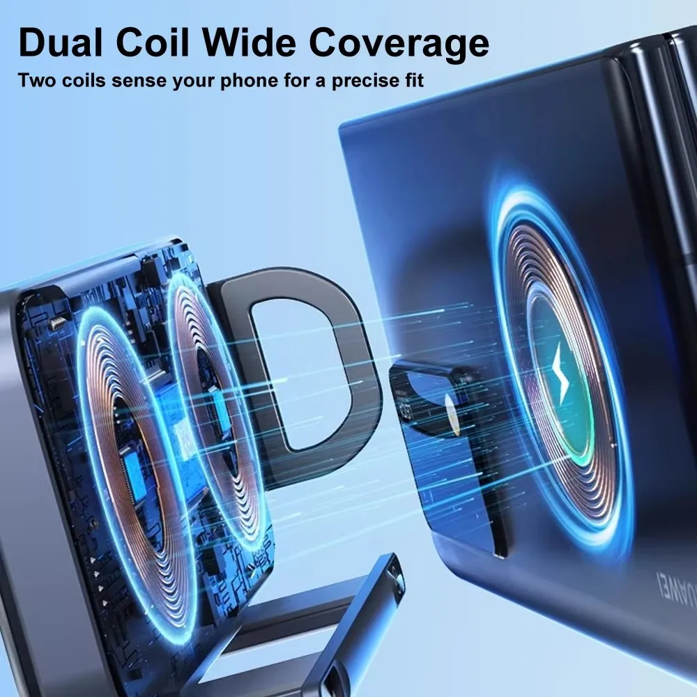 2. Design cu bobine duble, bobina din stânga este specială pentru Samsung Galaxy Flip, bobina din mijloc este pentru telefonul mobil pliabil și normal, drept, pentru utilizare orizontală.